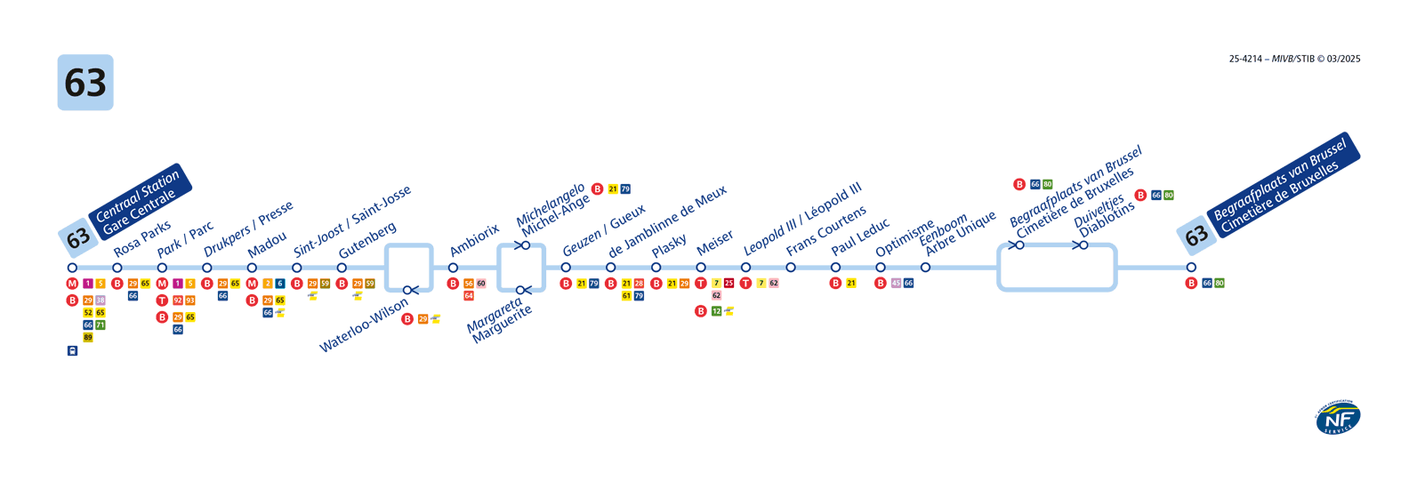 La ligne de Bus 63 propose 24 points d’arrêt répartis sur un trajet desservant les villes de Bruxelles, de Saint-Josse-ten-Noode, de Schaerbeek et de Evere.